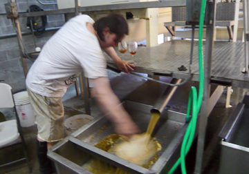 Receiving and processing the fruit was exhilirating and exchausting at once. Lost Slough did not have a truck free to deliver all of our 20 tons at once, so they had to send a dedicated foreman out with a 5-ton truck. He made four deliveries over the tedious and infernal Highway 12 that connects the Delta to Suisun Valley. We spent a lot of the day, and night, waiting for his next appearance. The “we” was a wonderful team: Rick Lanza from Wooden Valley Winery, our host (Tenbrink does not have a tank, or a press, big enough to make wine from 20 tons of grapes); Graeme; and several friends from NYC: Robert, Renée, Robb, Nicole.
